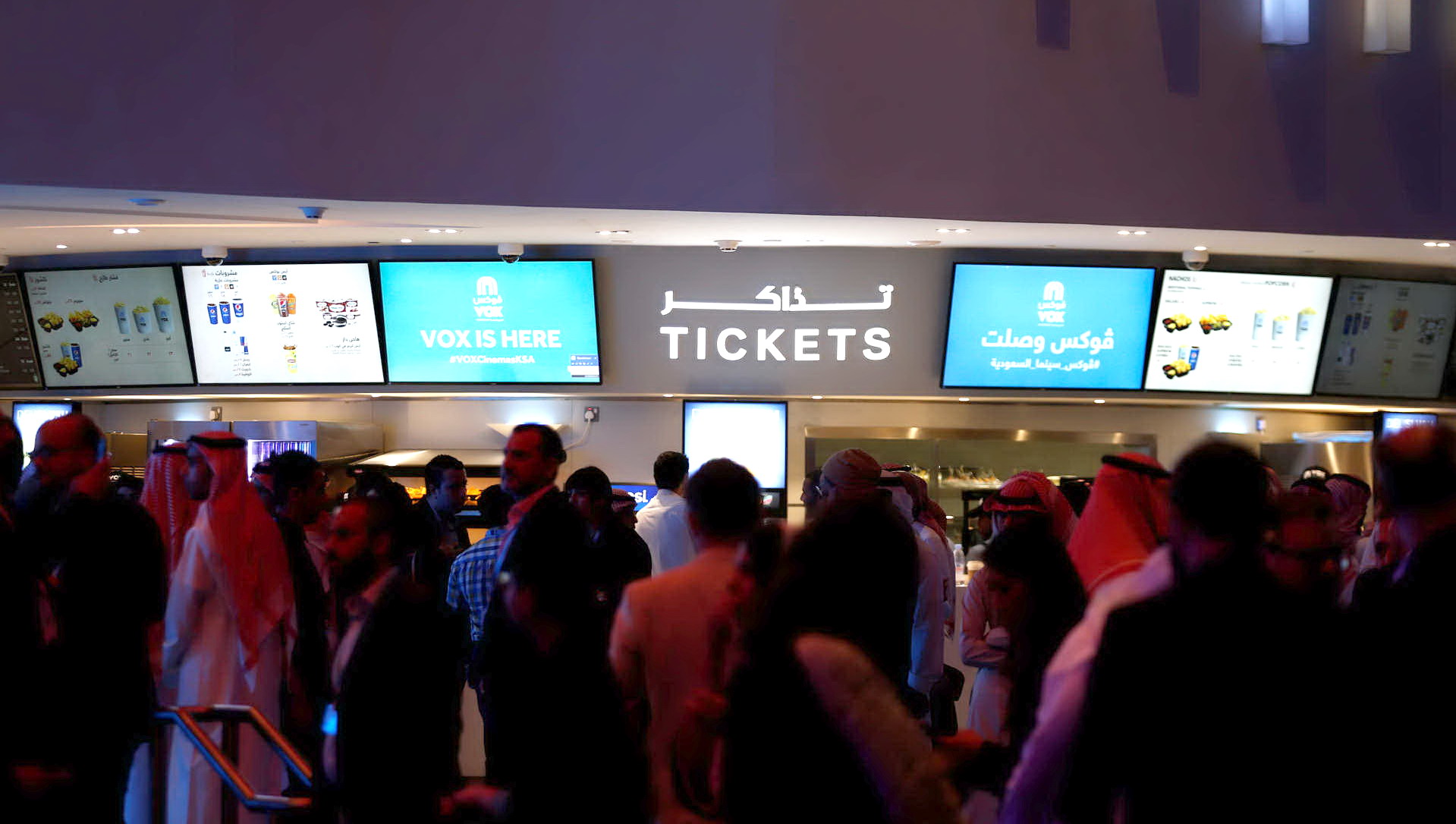 Saudi people gather at the ticket counter during the opening of a cinema at Riyadh Park mall in Riyadh